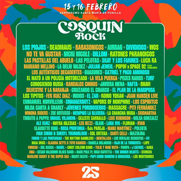 El próximo 15 y 16 de febrero más de 100 artistas se presentarán en 7 escenarios para ser parte de los festejos de los 25 años del Festival.La próxima edición de Cosquín Rock tendrá el histórico regreso de Los Piojos, la celebración de los de los 25 shows ininterrumpidos de Las Pelotas y la presentación de bandas icónicas como Airbag, Ratones Paranoicos y No Te Va Gustar, que en medio de sus giras multitudinarias se serán parte del Festival.