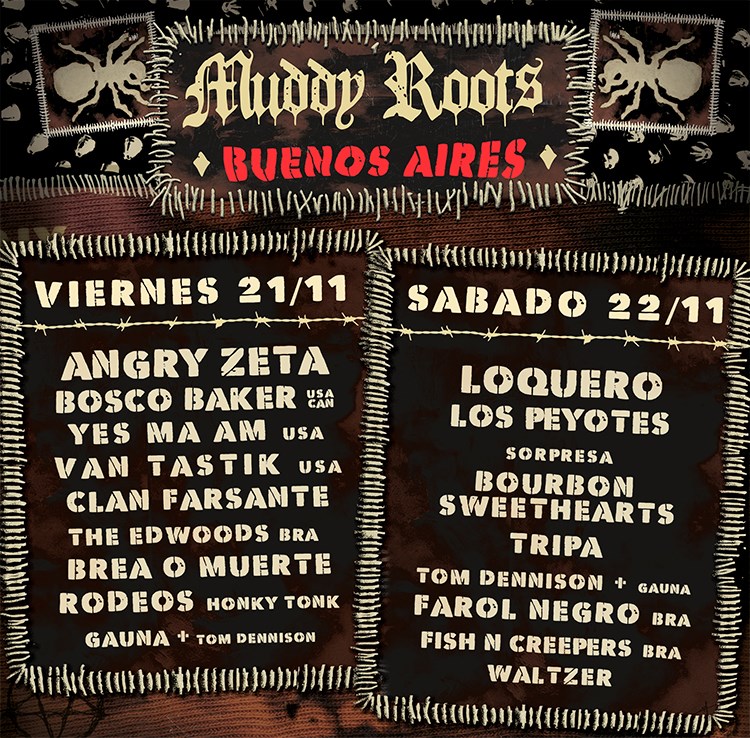 Después del éxito de su primera edición en 2024, Muddy Roots regresa a Buenos Aires con un nuevo festival.Muddy Roots convoca bandas nacionales e internacionales de country, folk punk, bluegrass, metal, música balcánica, psychobilly, entre otros géneros. Este año se presentarán Loquero, Angry Zeta, Yes Ma´am (USA), Bosko Baker (USA/Canada), Van Tastik (USA), Farol Negro (Brasil), Bourbon Sweethearts, Jay Bird (Colombia), The Ed Woods (Brazil), Clan Farsante (Rosario), Brea o Muerte, Tripa, Fish ´n Creepers (Brasil), Rodeos, Tom Dennison, RJ Gauna y Waltzer.